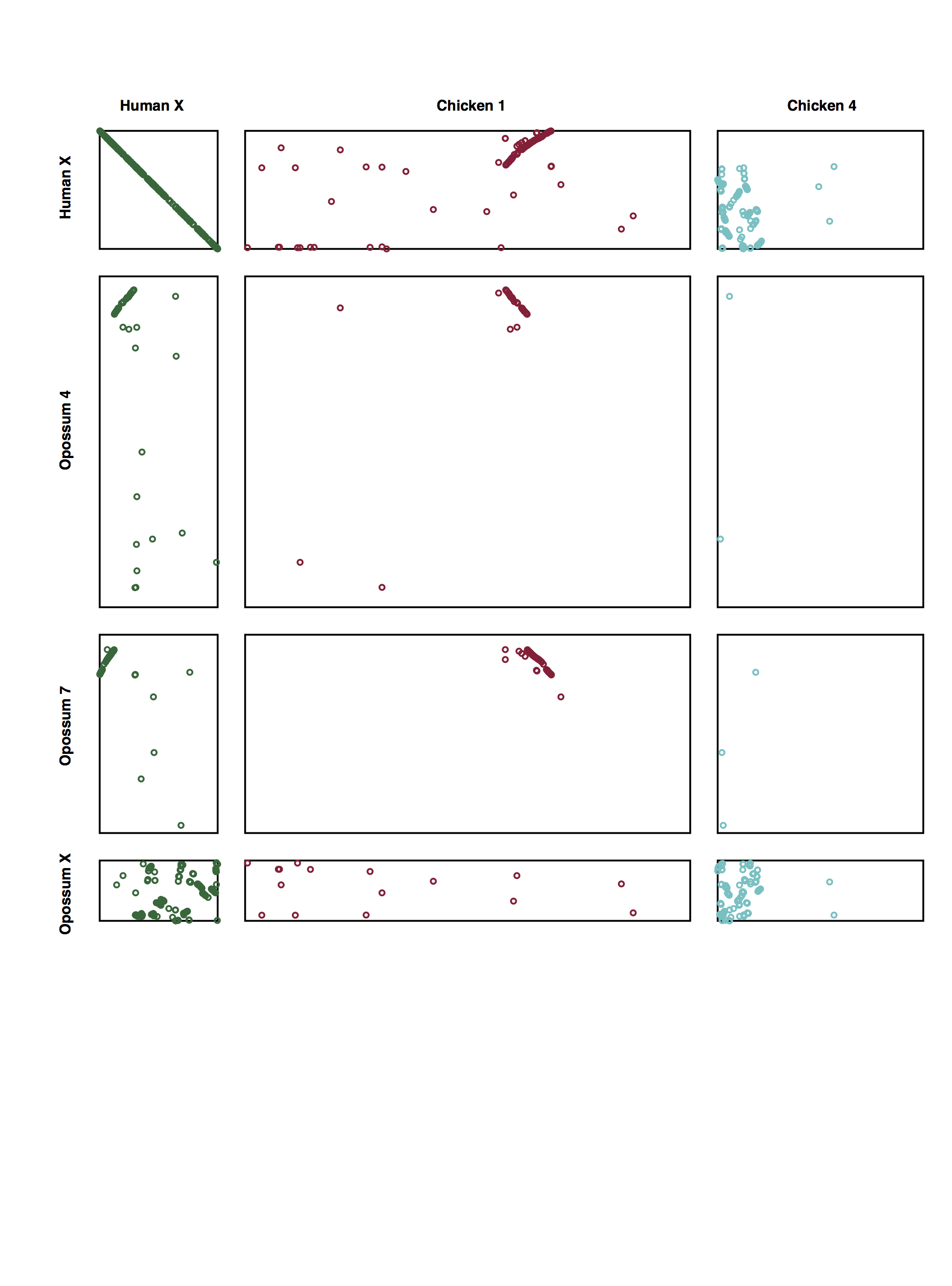 Dot plot of human X orthologues in opossum and chicken