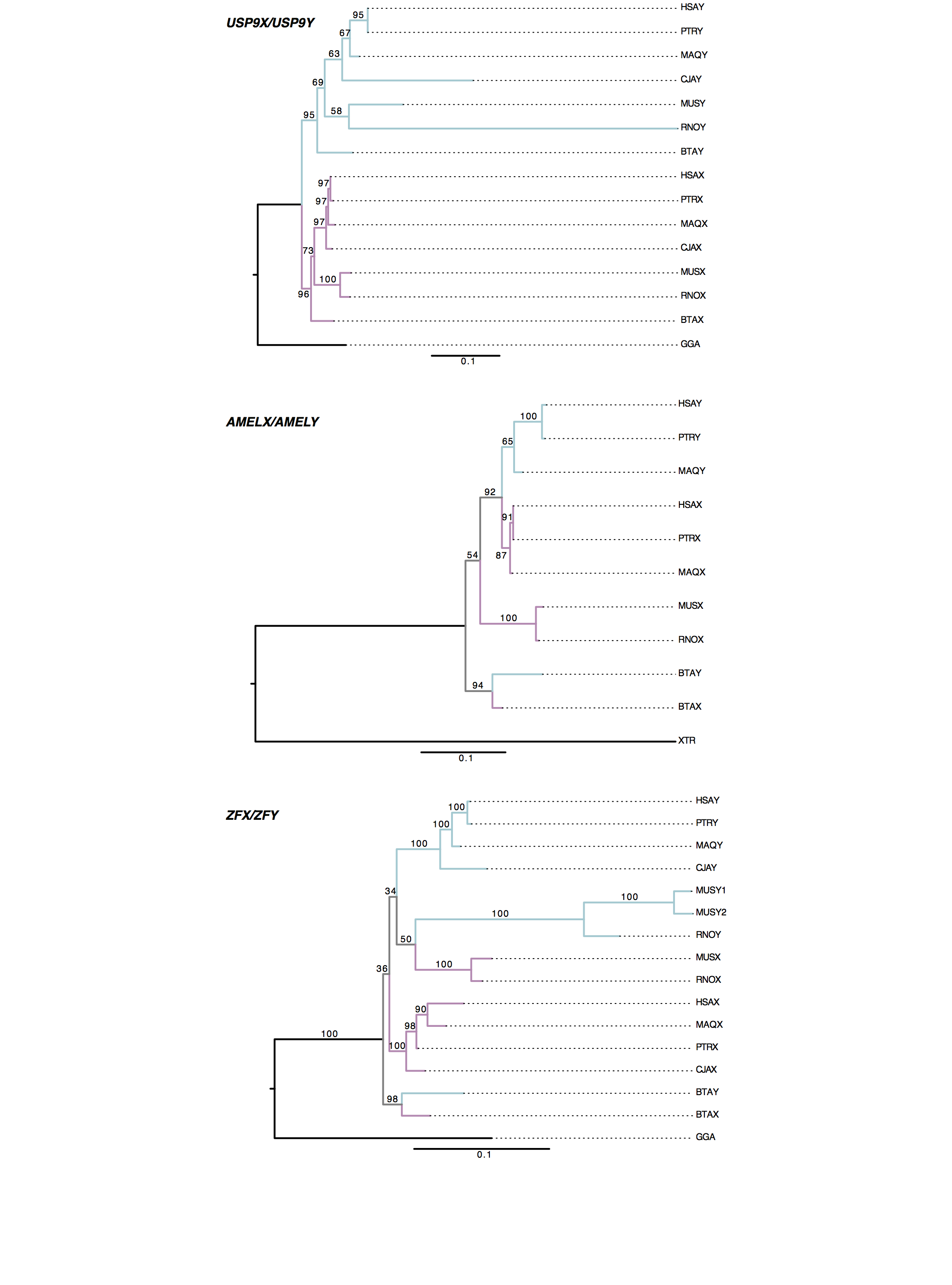 Phylogenetic tree showing X-Y gene conversion in AMELX/AMELY and ZFX/ZFY